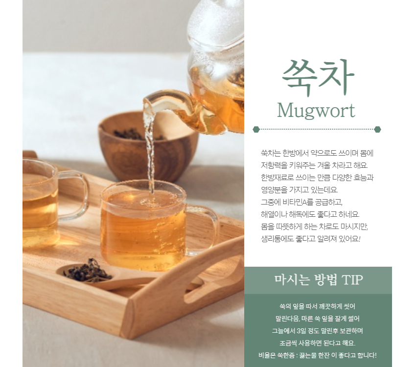 쑥차는 몸을 따뜻하게 하며, 자궁 또한 따뜻하게 해주는 차로 유명하다.